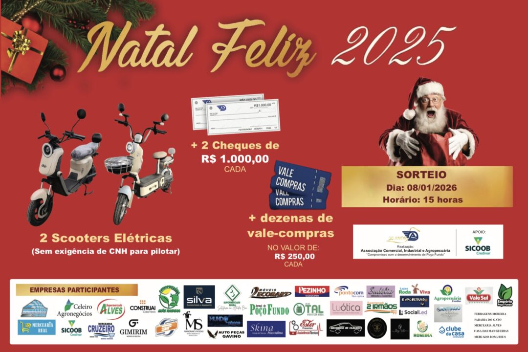 Iniciada no dia 11 de outubro (sábado), a Promoção Natal Feliz 2025, da Aciapf (Associação Comercial, Industrial e Agropecuária de Poço Fundo) segue a todo vapor. Com menos de um mês de lançamento, a campanha já foi aderida por 41 empresas gimirinenses e tem alcançado seus principais objetivos: incentivar as vendas de fim de ano na cidade, valorizar o comércio local e celebrar as festividades natalinas. Todos os estabelecimentos participantes…